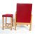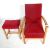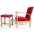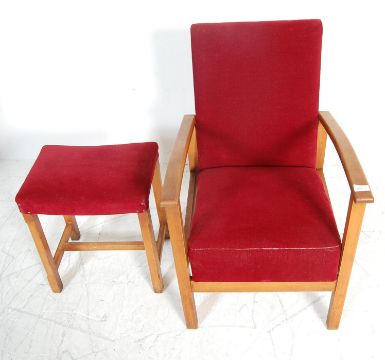 A vintage retro 20th century Danish inspired bedroom chair / easy chair. The chair having red upholstery show wood frame raised on square legs together with a matching stool. 81cm h x 64cm w x 53cm d