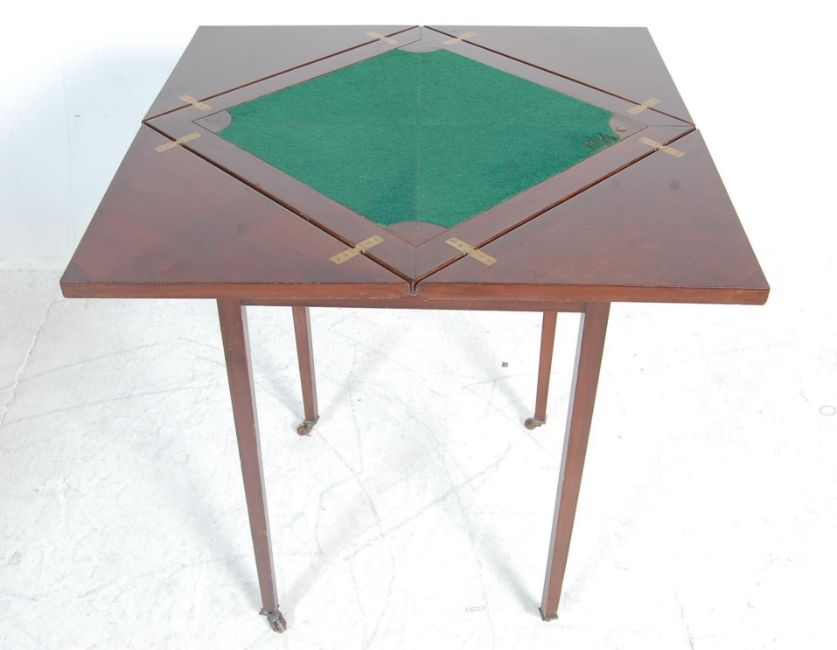 A 19th century Victorian mahogany game / gaming table / occasional table. the table having a square metamorphic top with four triangle shaped hinged leaf opening to reveal a green cloth top raised on tapered supports with casters and single drawer to the frieze. Measures 78 cm H x 51 cm W x 51 cm D