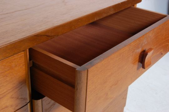 A retro vintage 20th century teak wood sideboard credenza having a bank of three drawers to the right and a larger bank of three drawers to the left. All with shaped wooden handles raised on an upright base. 64cm h x 138cm w x 44cm d