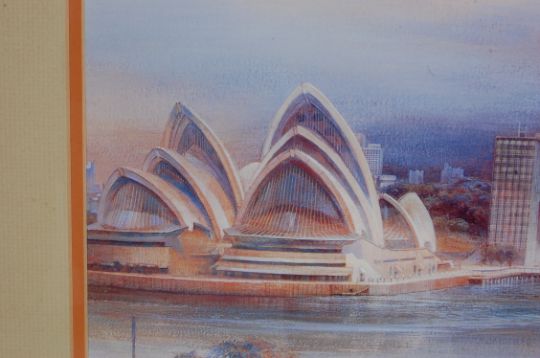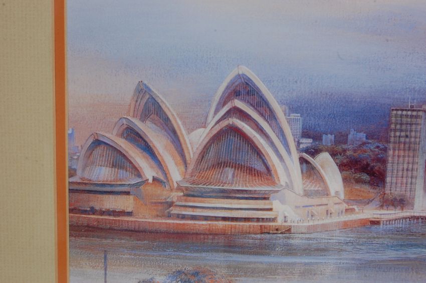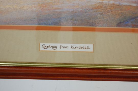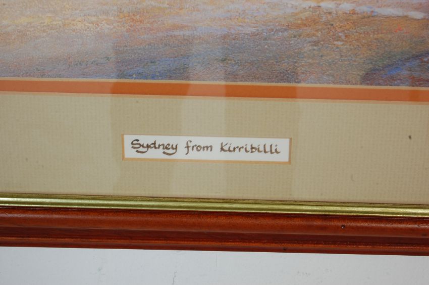 A large vintage retro 20th century lithograph print. The print named “ Sydney From Kirribilli “depicting the Sydney bridge. Framed and glazed.