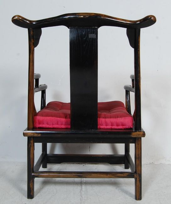 A vintage 20th century Chinese hardwood horseshoe chair having two tiered shaped armrests over a cushioned seat raised on square supports united by stretchers. Measures 95 cm H x 64 cm W x 54 cm D