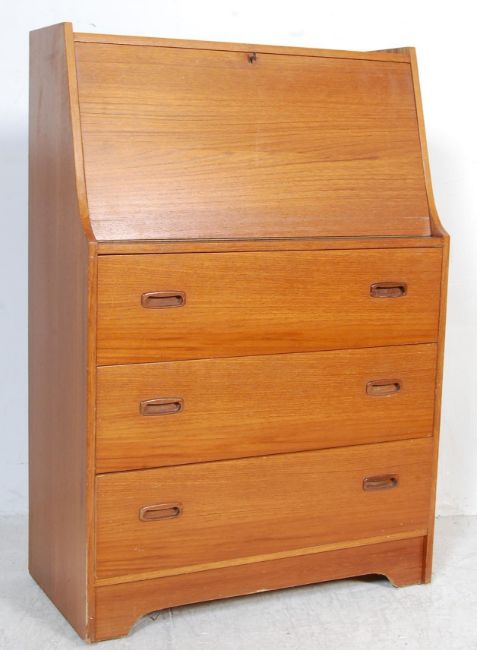 A retro vintage teak wood student bureau having a fall front writing area opening to reveal a fully appointed interior atop a bank of three spacious drawers raised on bracket feet. 108cm h x 73cm w x 36cm d