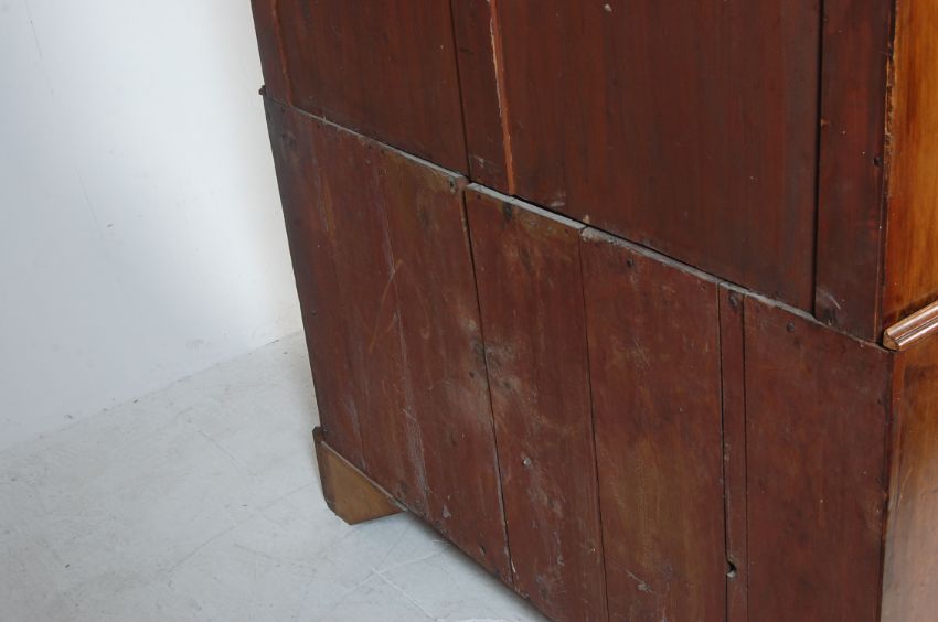 An 18th century George III mahogany linen press. Raised on ogee bracket feet with short and deep drawer configuration having linen cupboard atop being converted to hanging. Flared cornice above.