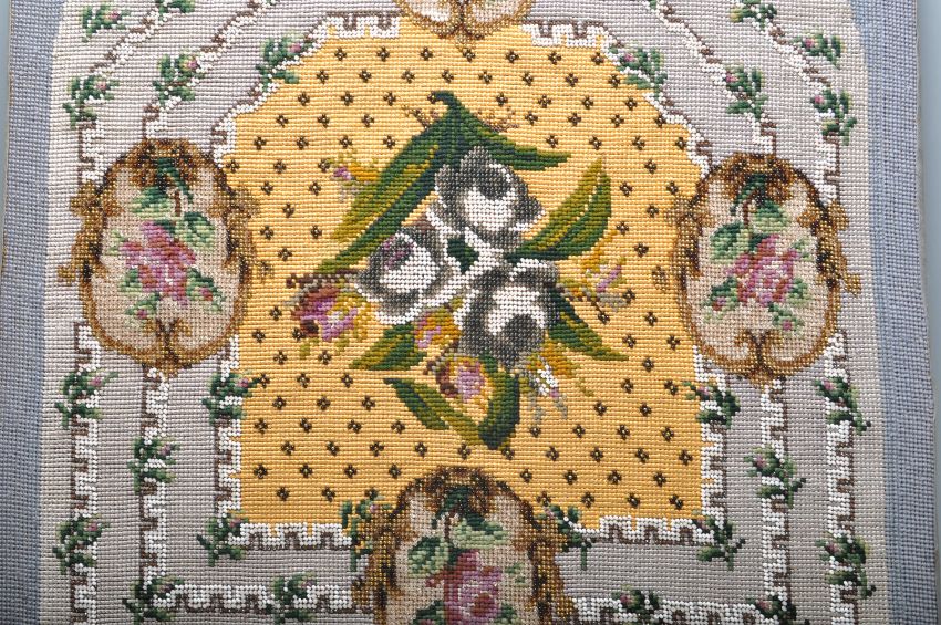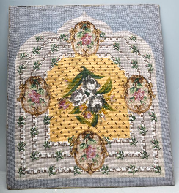 An early 19th century Berlin bead work sampler in the form of an armorial shield having floral cartouche panel works and with central spray of flowers on yellow ground. Measures 54cm x 46cm.