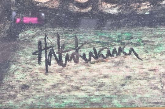 A retro vintage 20th Century 70’s South African abstract charcoal / pastel mixed media on paper drawing / painting depicting a group of stylized figures intertwined. Good use of colours with the dark boards makes this pieces stand out. Signed Kwame. Set with a mid-century brass tone frame and being glazed. Measures approx; 102cm x 64cm.