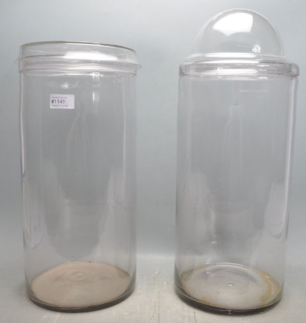 A pair of large vintage retro 20th century glass confectionery jars. The jars of a large cylindrical form made of clear glass. Measures 44 cm H x 20 cm Diameter