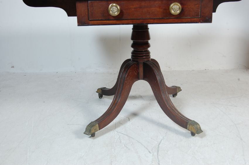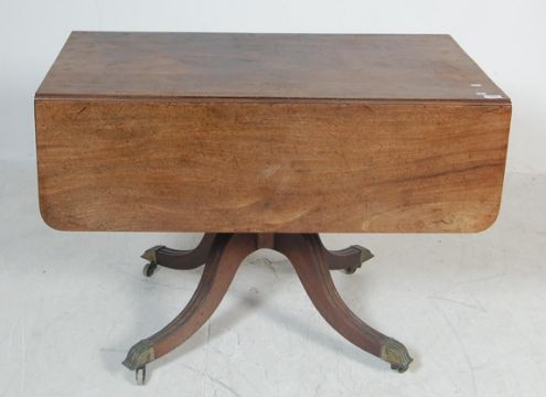 A 19th century Georgian mahogany sofa table having two drop leaves over a single drawer to the frieze with brass round handles raised on a turned column with a quadruped splayed base set on brass feet and castors.  Measures, 72 cm H x 114 cm W x 102 cm D
