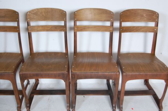 A collection of six retro vintage industrial dining chairs having faux wood metal frames, plywood back rest and seats raised on shaped metal supports united by a single stretcher. 84cm h x 40cm w x 40cm d