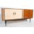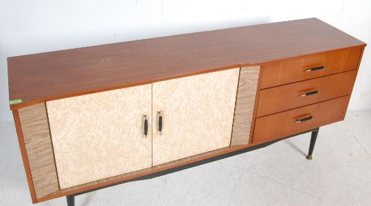 A retro vintage mid 20th century 1950s Formica and teak sideboard credenza having a bank of three drawers to the right and a double door cupboard to the right 73cm h x 162cm w x 39cm d
