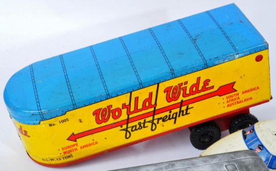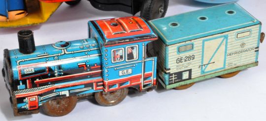 A collection of assorted vintage tin plate and clockwork toys of various scales and makers to include Louis Marx / Marx Toys mechanical wind up train (boxed), German CKO friction motor bus (boxed, Marx truck with freight trailer and others. Interesting assortment.