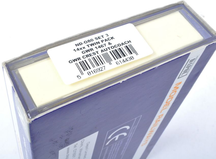 An original boxed Dapol made N gauge model railway trainset locomotive engine No. ND-808 Set 3. The set being a Class 14XX twin pack with GWR 1467 loco and GWR crest autocoach. Highly detailed set appearing mint, within original box.