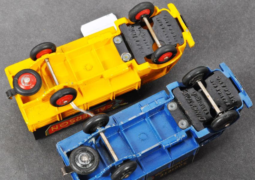 French Dinky Toys - two original vintage Dinky Toys made diecast models - the first No. 25JJ ' Ford Bache Calberson '. Yellow body, with black trailer cover. Original Calberson decals present. French maker's marks to base. Model appears G+ to VG. The second ' Societe Des Chemins - Nationale Francais '. Blue body with black trailer cover, original decals. Model G+ to VG. Both unboxed.