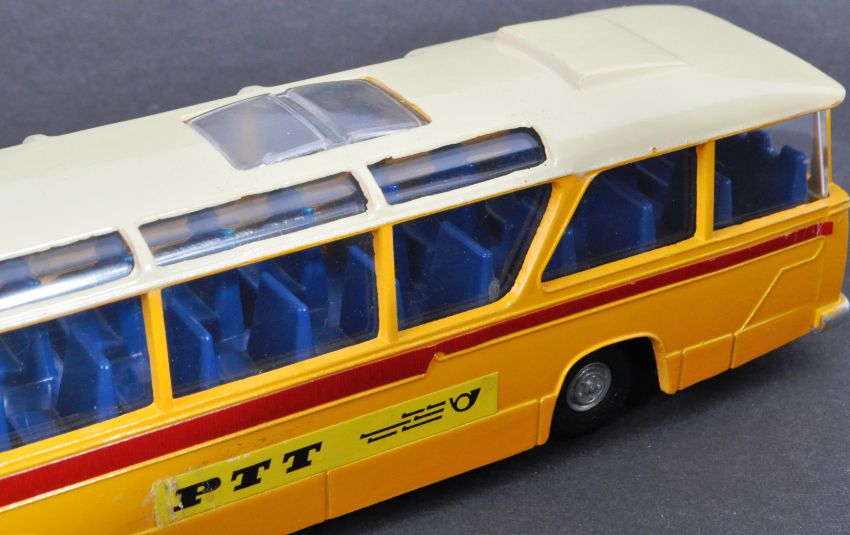 Dinky Toys - an original vintage Dinky Toys made boxed diecast model No. 961 ' Swiss Postal Bus '. Yellow and white body, with opening boot. Made In England to base. Model appears mint (some light blemishes to decal on one side). Housed in its original box, which is generally VG to VG+. Rare in this condition.