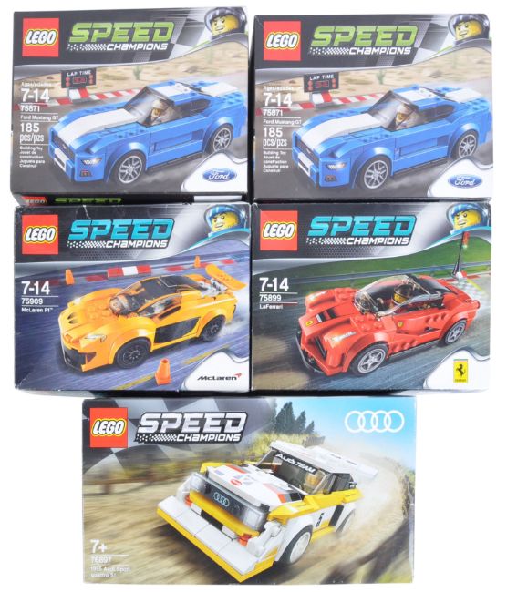 Lego Sets - Lego Speed Champions - 76897 / 75871 / 75899 / 75909 - a collection of x original boxed Lego Speed Champions boxed sets to include 76897 Audi Sport Quattro S1, 75871 Ford Mustang GT (X2), 75899 Ferrari and 75909 McLaren P1. All sets appear to be resealed but the vendor assures us both sets are 100% complete with instructions present.From a large private collection of Lego - the vendor assures us sets are 100% complete (where stated) but contents have not been checked by us. In the majority of cases boxes have been resealed to secure the contents (unless stated as 'factory sealed' in which case the set is unopened). East Bristol Auctions cannot guarantee completeness.