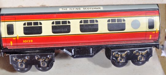 An original vintage Chad Valley made O gauge clockwork model railway trainset locomotive set No. 10117 ' Trainset De Luxe '. The set containing a British Railways blue loco with tender, x3 Flying Scotsman coaches / carriages, a selection of track and the original key. Housed within the original (tatty) box.