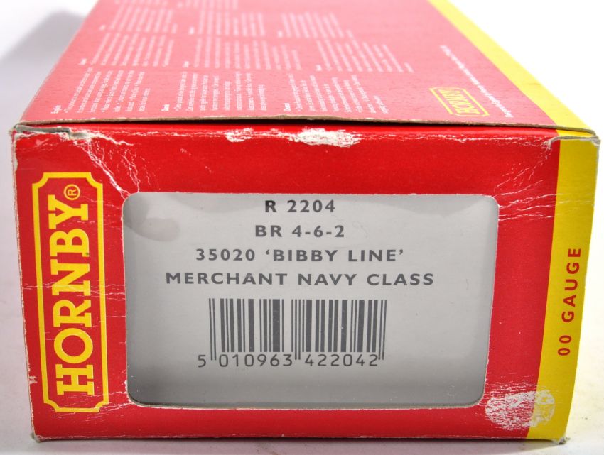 An original boxed Hornby 00 gauge model railway trainset locomotive engine No. R2204 British Railways 35020 Merchant Navy Class ' Bibby Line '. The highly detailed loco appearing mint, within original box.