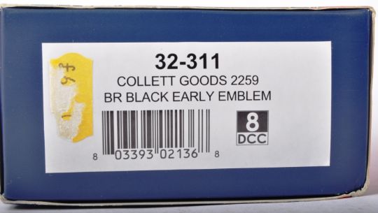 An original boxed Bachmann made Branch Line 00 gauge model railway trainset locomotive engine No. 32-311 Collett Goods 2259 British Railways black early emblem. Highly detailed model appearing mint, within original box.