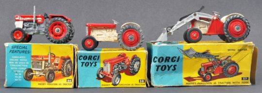 A collection of x3 original vintage boxed Corgi Toys diecast model tractors comprising models No. 50 Massey Ferguson 65 Tractor, 57 Massey Ferguson 65 Tractor with fork and 66 Massey Ferguson 165 Tractor. Condition ranging from good to good+ within original boxes (some flaps missing).