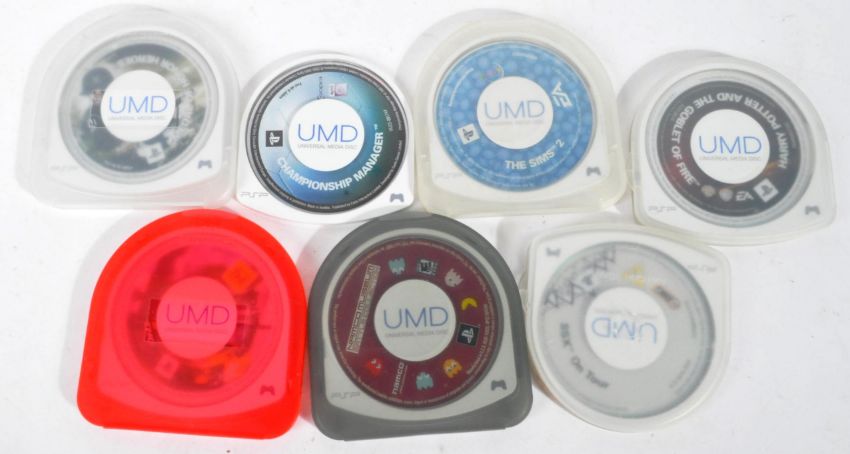 A large collection of original Sony made PSP PlayStation portable video games consoles and games comprising two games consoles, approx 40 games / UMD including Grand Theft Auto, Secret Agent Clank, James Bond, X-Men and more. Various accessories present.