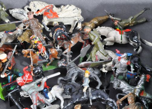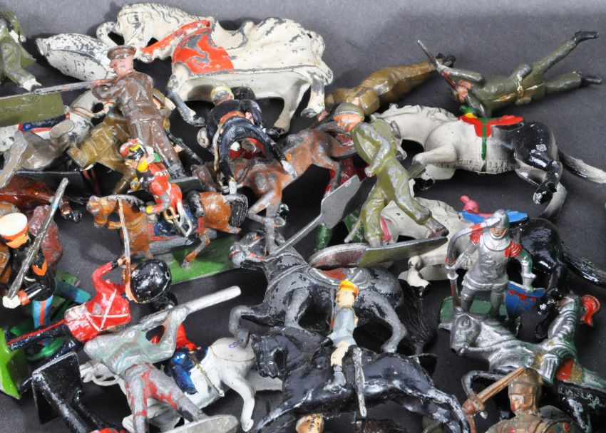 Lead Soldiers - a large collection of antique and vintage lead soldiers - mostly Britains but some others also present (Johillco). Includes mounted soldiers, horses, infantry, WWI First World War soldiers, Johillco Gladiator, Royal Guards etc. Along with x2 boxes of later unpainted white metal soldiers and horses. Various scales and conditions. Likely 150+ pieces.