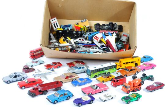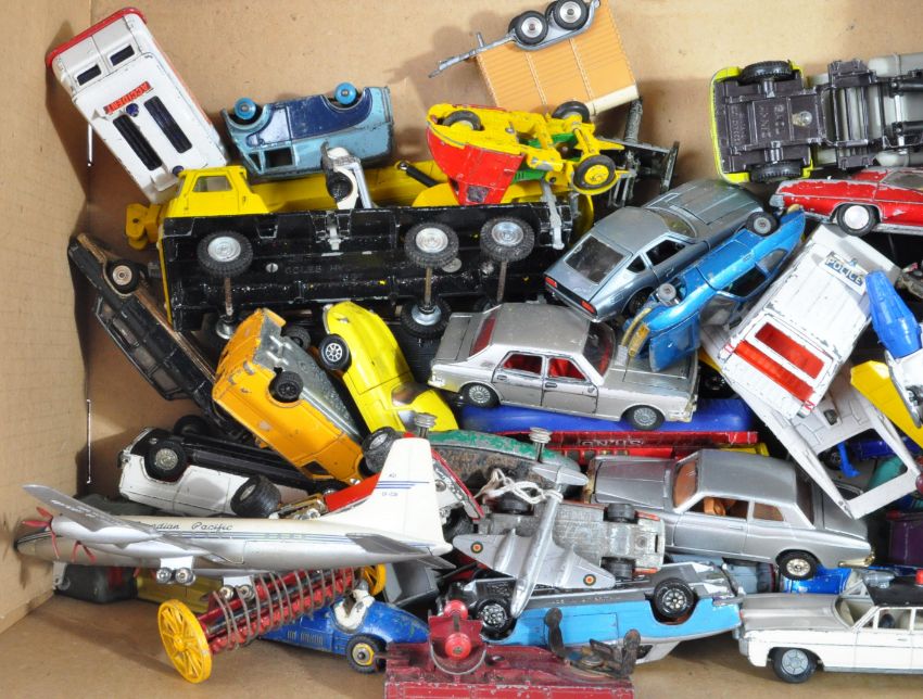 Large collection of approximately x80 original vintage Dinky Toys, Corgi Toys and Budgie Toys diecast model cars and other vehicles. Examples to include; Dink Toys Ford Transit Van Ambulance, Police Range Rover, Bedford Van, Jaguar Type D, Rolls Royce Silver Shadow, SRN6 Hovercraft, Ford Zodiac, Corgi Toys Mercedes-Benz 600 Pullman, Buck Rogers Star Fighter, Ford Thunderbird, Whizzwheels Ford Cortina and others. Models appearing fair to good.