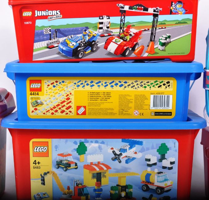A collection of x6 assorted Lego building bucket sets comprising 5539 Creator Bucket, 4414 Creator Half Tub Blue, 5483 Ready Steady Build & Race, 10668 Lego Juniors The Princess Play Castle, 10673 Lego Juniors Race Car Rally and 41906 Lego Dots Pencil Holder (factory sealed). All other sets appearing to be resealed but the vendor assures us they are 100% complete with instructions present.From a large private collection of Lego - the vendor assures us sets are 100% complete (where stated) but contents have not been checked by us. In the majority of cases boxes have been resealed to secure the contents (unless stated as 'factory sealed' in which case the set is unopened). East Bristol Auctions cannot guarantee completeness.