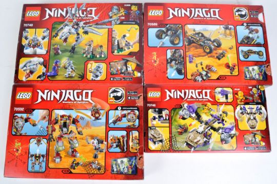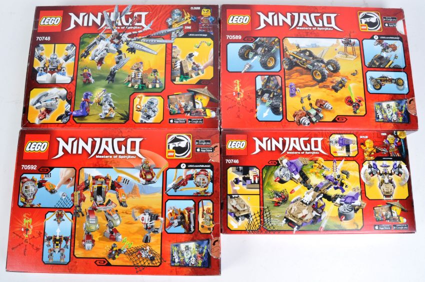 Lego Sets - Lego Ninjago Masters of Spinjitzu - a collection of x4 original boxed Lego Ninjago Masters of Spinjitzu sets comprising 70589 Rock Roader, 70592 Salvage MEC, 70746 Condrai Copter Attack and 70748 Titanium Dragon. The now retired sets appearing to be resealed to one side but the vendor assures us the sets are 100% complete with instructions present.From a large private collection of Lego - the vendor assures us sets are 100% complete (where stated) but contents have not been checked by us. In the majority of cases boxes have been resealed to secure the contents (unless stated as 'factory sealed' in which case the set is unopened). East Bristol Auctions cannot guarantee completeness.