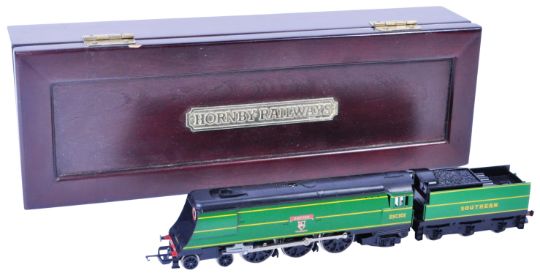 An original boxed Hornby 00 gauge model railway trainset locomotive engine No. R320-HX West Country Class ' Exeter ' 21C101 Southern Railways. Housed within a dark wood presentation box. Highly detailed model appearing mint.