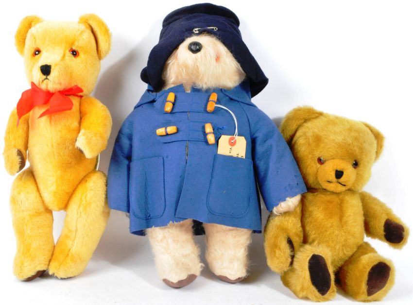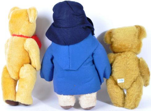 Teddy Bears - an original vintage Gabrielle Designs made Paddington Bear teddy with duffel coat, hat and original tag. Measures approx; 49cm tall. Along with Deans Childsplay Toys golden mohair bear with growler (43cm tall) and a vintage Pedigree made brown teddy bear with felt paws and orange / black glass eyes (37cm tall).