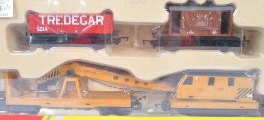 A collection of x3 original boxed Hornby made 00 gauge model railway trainset locomotive rolling stock box sets. Sets to include; R6367 Coal Wagon Pack (x2) and R6365 Breakdown Pack. All contents appearing mint, within original boxes.