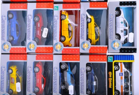 A large collection of x25 assorted 1/43 scale Cararama made boxed diecast model cars and other vehicles to include; BMW Z8 Roadster, BMW E1, Saab 9.5 Aero, Lexus GS300, Chebrolet 3100 Pick Up, Mercedes-Benz CLK Coupe and others. All contents appearing mint, within original boxes.