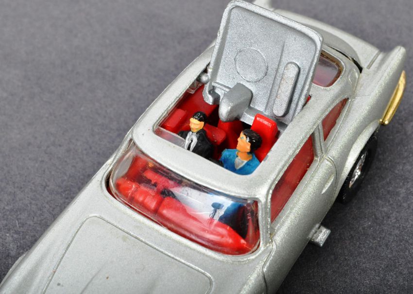 A vintage Corgi made James Bond Aston Martin DB5 diecast model c1977. Silver, with red interior. Complete with driver, ejector seat figure and a spare ejector figure. Housed within its original display box. Model generally near mint, box G to G+.