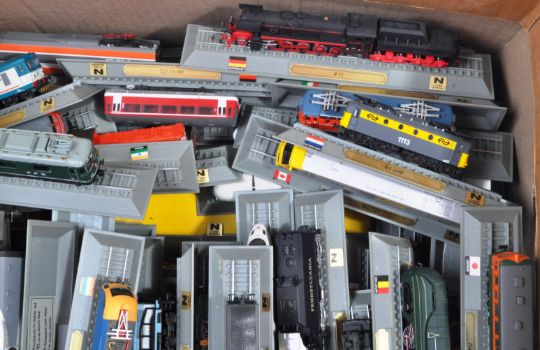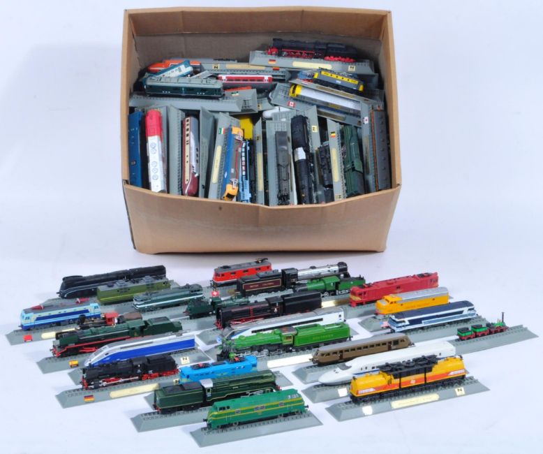 A large collection of approx 100+ Del Prado made N gauge model railway trainset static model trains. Comprises various liveries, diesel, steam and international examples. All set to plinth bases with name plates. Conditions vary with most appearing in good condition and some with possible minor details not present. Good collection.