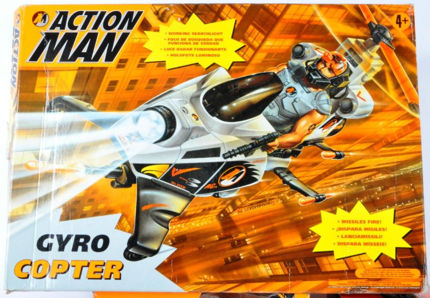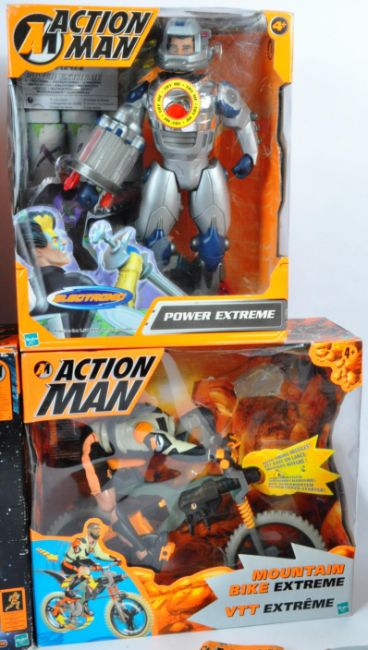 Action Man - a collection of Hasbro 1990s boxed Action Man figures and playsets. Comprising: Power Extreme Action Man, Photo Mission, Gyro Copter, Sky Diver, Mountain Bike Extreme, Cameraman Survival Projector Set, Space Explorer etc. All contents appear to have been removed, but generally appear complete (unchecked). All within the original boxes.
