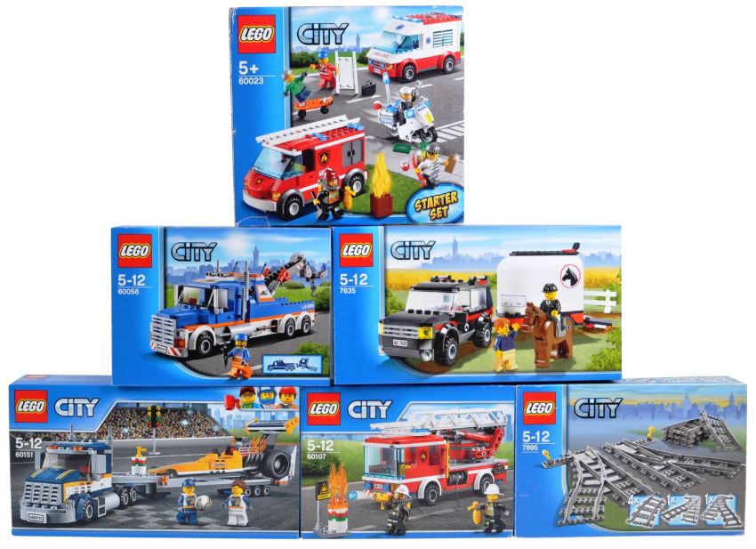 Lego Sets - Lego City - a collection of x6 original boxed Lego City sets comprising 7635 Four Wheel Drive with Horsebox, 7895 Switching Tracks, 60023 City Starter Set, 60056 Tow Truck, 60107 Fire Ladder Truck and 60151 Dragster Transporter. All sets appearing to be resealed but the vendor assures us all sets are 100% complete with instructions present.From a large private collection of Lego - the vendor assures us sets are 100% complete (where stated) but contents have not been checked by us. In the majority of cases boxes have been resealed to secure the contents (unless stated as 'factory sealed' in which case the set is unopened). East Bristol Auctions cannot guarantee completeness.