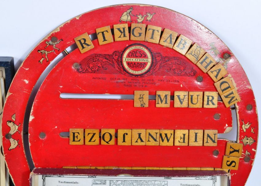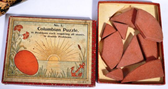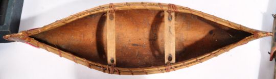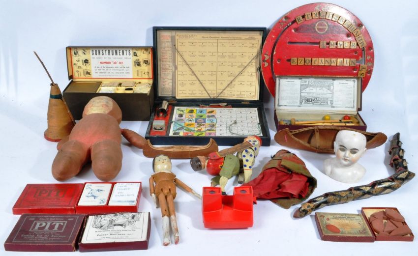 Antique Toys - a collection of antique toys to include; an early 20th century Peg / Dutch Doll (one foot AF) of traditional form in the manner of Grodnertal, a detailed wooden model of a canoe and similar wooden Wigwam toy, an antique German made bisque doll's head, a wooden Clown Trapeze toy, wooden snake, boxed set of Construments No. 20 Set, Busley's Table Croquet and other items.