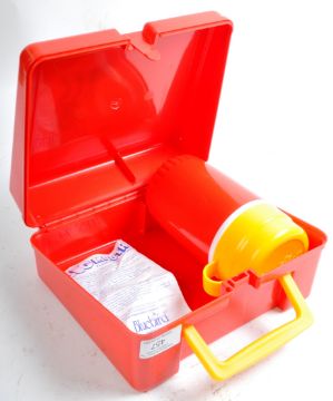 An original vintage 1985 Bluebird made Kenner Mask retro lunch storage box with thermos. Red plastic construction with yellow handle, still retaining the original sticker decal to the front. Thermos flask appearing unused with original instructions present. Great example