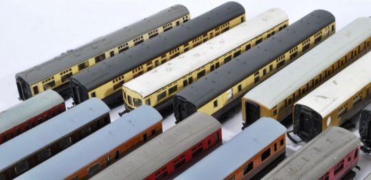 A collection of 50x assorted Hornby Dublo, Hornby Railways, Mainline, Lima, Trix and other 00 gauge model railway trainset locomotive rolling stock to include GWR coaches / carriages, coal wagons and more. Conditions vary. Good collection.