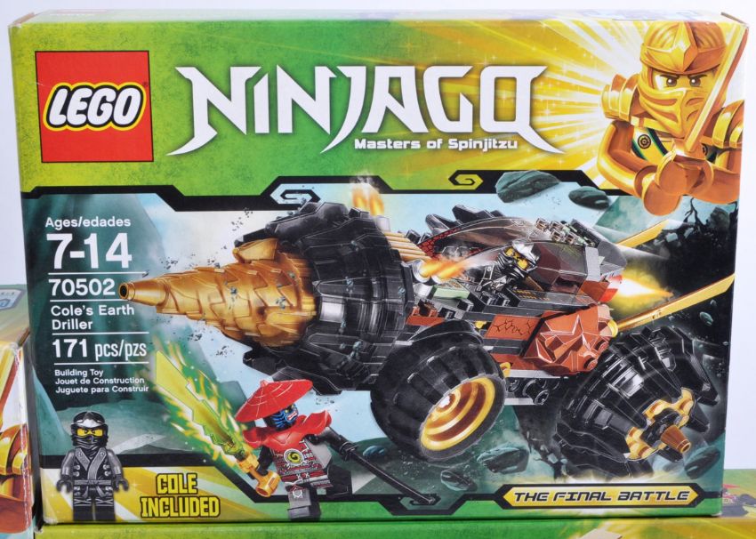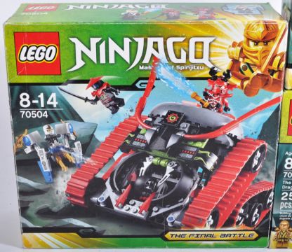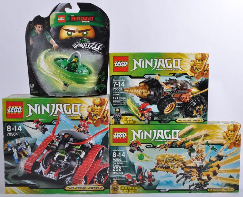 Lego Sets - Lego Ninjago Masters of Spinjitzu - a collection of x4 original boxed Lego Ninjago Masters of Spinjitzu sets comprising 70502 Cole's Earth Driller, 70503 The Golden Dragon, 70504 Garmatron and 70628 Lloyd - Spinjitzu Master (factory sealed). Sets appearing to be resealed but the vendor assures us all sets are 100% complete with instructions present.From a large private collection of Lego - the vendor assures us sets are 100% complete (where stated) but contents have not been checked by us. In the majority of cases boxes have been resealed to secure the contents (unless stated as 'factory sealed' in which case the set is unopened). East Bristol Auctions cannot guarantee completeness.