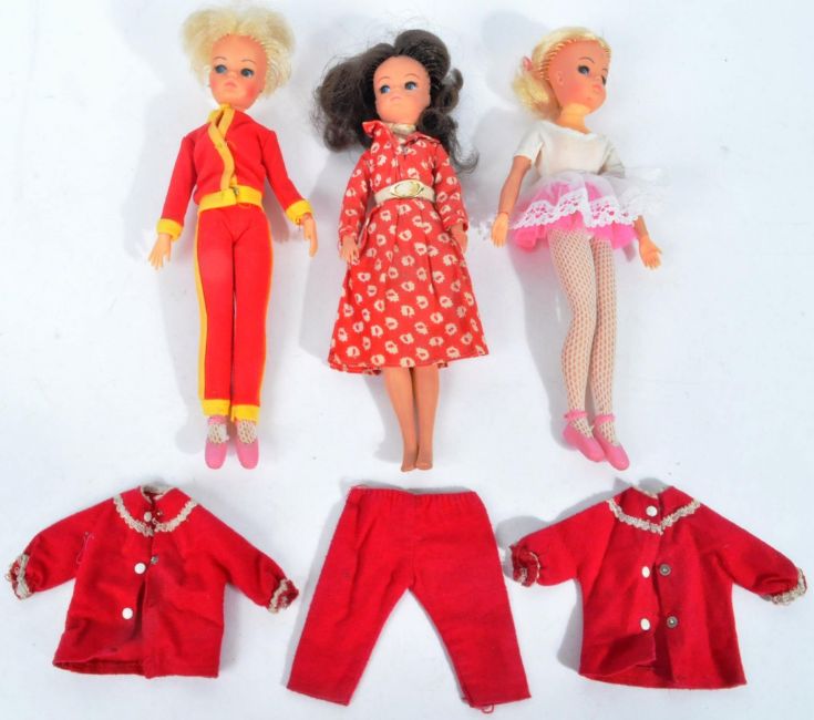 Sindy - a collection of x3 original vintage 1970s Pedigree made Sindy dolls. Each dressed in a period outfit. Includes; blonde ballerina Sindy, red two-piece Sindy and a black haired Sindy doll with red and white dress. Two appearing complete, one lacking shoes.