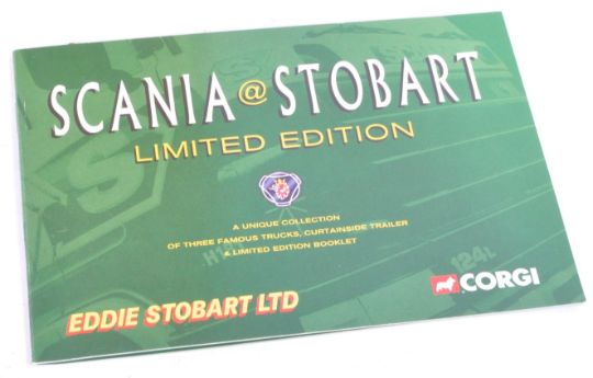 Corgi Eddie Stobart - a boxed Limited Edition Corgi made diecast model haulage set CC99155 ' Scania @ Stobart '. 1/50 scale. Appears mint and unused, with certificate. Housed in its original presentation box with wingmirrors unopened. Highly detailed models.