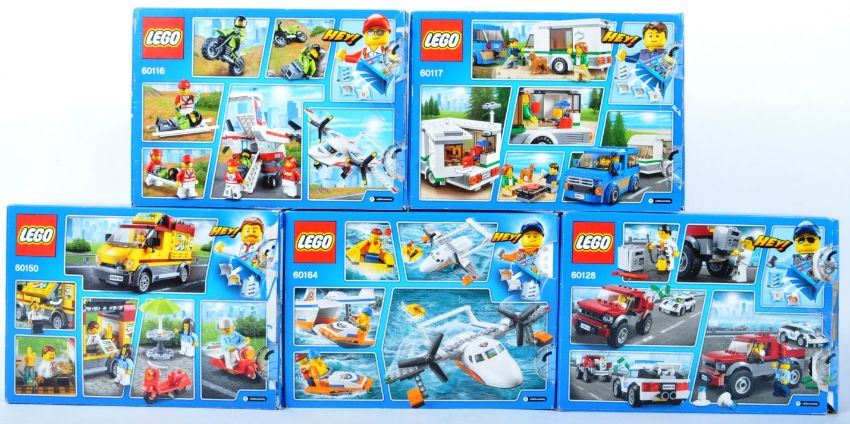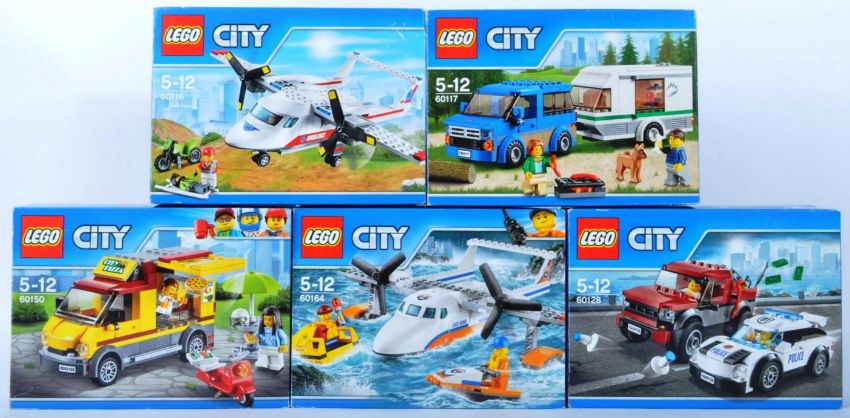 Lego Sets - Lego City - 60116 - 60117 - 60128 - 60150 - 60164 - a collection of x5 original boxed Lego City sets comprising 60116 City Ambulance Plane, 60117 City Van & Caravan, 60128 Police Pursuit, 60150 City Pizza Van and 60164 Sea Rescue Plane. All sets resealed and believed complete but remain unchecked by us.