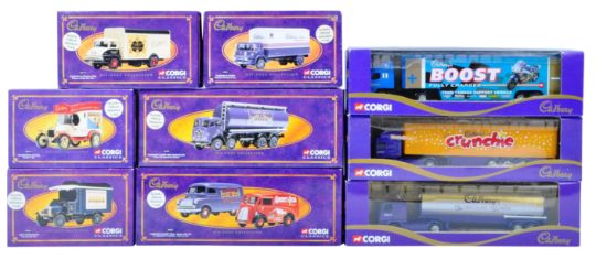 Cadbury's Chocolate - a collection of x9 boxed Corgi made diecast models relating to Cadbury. Includes models: 59514, 59501, 59519, 09001, 08101, 30310, 12101, 08007 and 18701. All appearing mint, within their original boxes.
