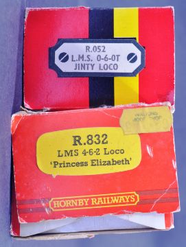 Two original vintage boxed Hornby 00 gauge model railway trainset locomotive engines comprising; R.052 LMS Jinty and R.832 LMS Princess Elizabeth. Highly detailed locos appearing mint, within original original boxes.