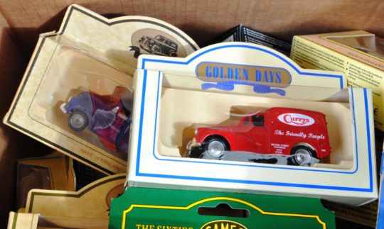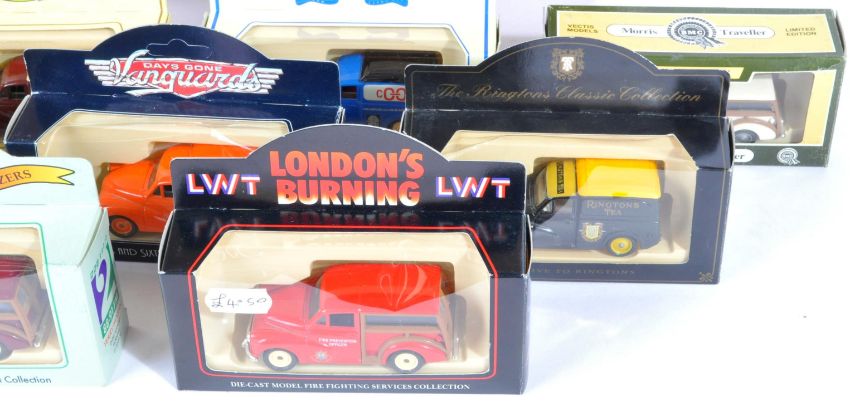 A collection of approximately x40 assorted boxed diecast model cars and other vehicles, largely Lledo Promotional models with some Days Gone, Vanguards and others present. Examples of classic cars, haulage and public transport, largely advertising related. All housed within original boxes.