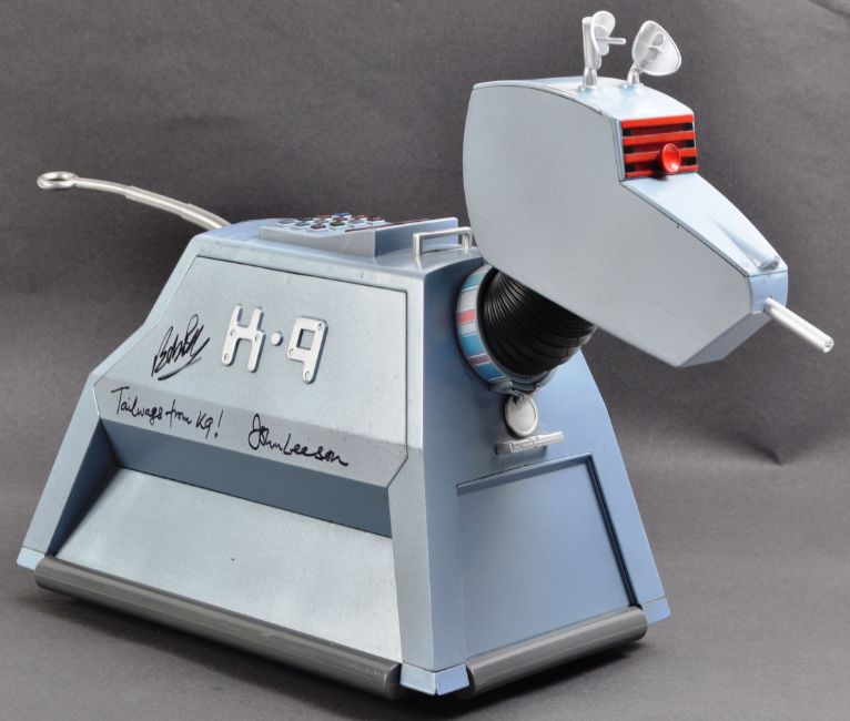 Doctor Who - John Leeson (Voice) and Bob Baker (creator) - a large 1/4 scale model of K9 from Dr Who. Autographed to the side by Leeson and Baker. Both neatly signed in black ink, Leeson adding the character name and catchphrase. Signed to the removable side panel. Autographs obtained in person - supplied with a certificate of authenticity. Fantastic display piece. Approx 14" long.
