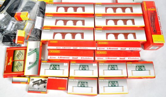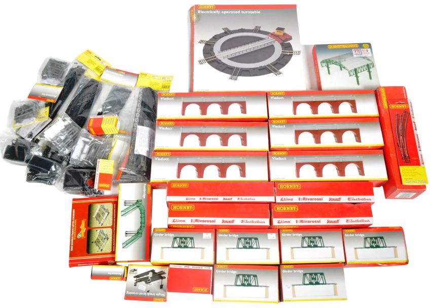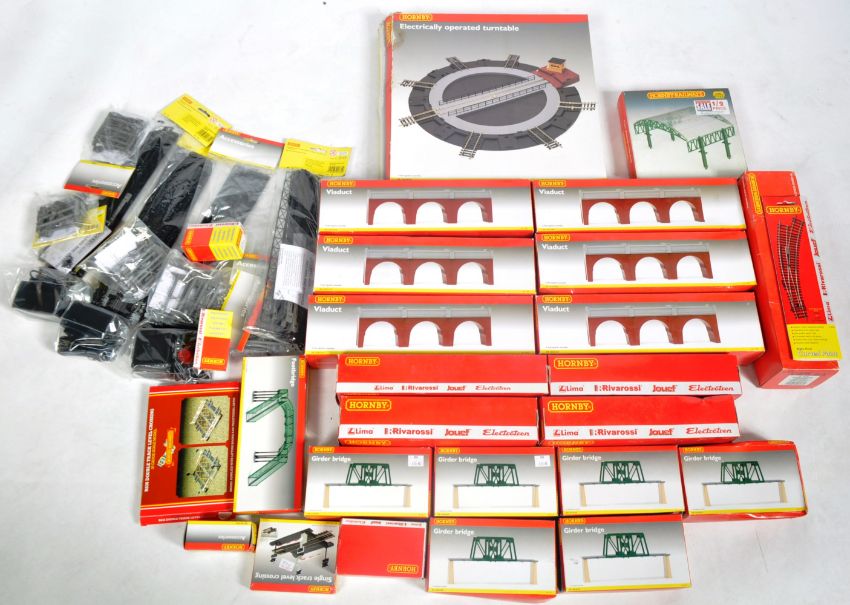 A large collection of assorted Hornby 00 gauge model railway trainset locomotive trackside accessories to include x6 R180 Viaduct Bridge, x6 R657 Girder Bridge, R070 Electric Motorised Turn Table, X4 R660 Elevated Track Sidewalls, R334 Station Over Roof and lots more. Great assortment.