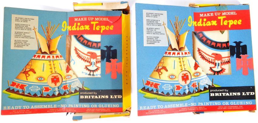 Two original vintage Britains made Cow Boys & Indians / Wild West models of Indian Tepees. Vinyl covering with plastic bases and framework poles. Ready to assemble. Housed within original boxes.