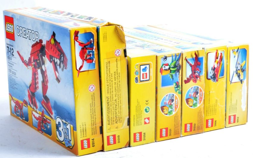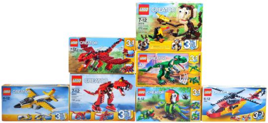 Lego Sets - Lego Creator 3 in 1 - a collection of x7 Lego Creator 3 in 1 boxed sets comprising sets No. 31032 Red Creatures, 31058 Mighty Dinosaurs, 31019 Forest Animals, 5866 Rotor Rescue, 31031 Rainforest Animals, 6914 Prehistoric Hunters and 6912 Super Soarer. All sets appearing to be resealed but the vendor assures us the sets are 100% complete.From a large private collection of Lego - the vendor assures us sets are 100% complete (where stated) but contents have not been checked by us. In the majority of cases boxes have been resealed to secure the contents (unless stated as 'factory sealed' in which case the set is unopened). East Bristol Auctions cannot guarantee completeness.