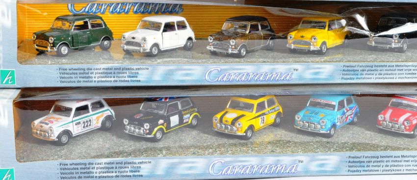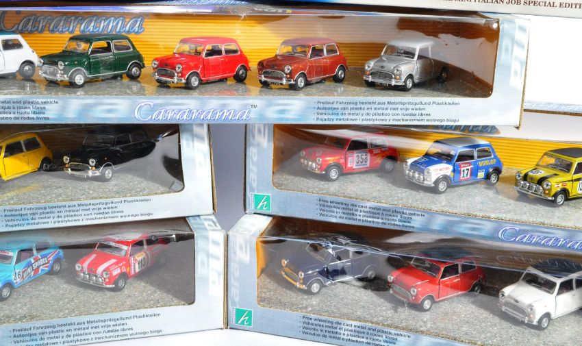 A collection of x8 boxed Corgi and Cararama made diecast Mini Cooper model sets to include x5 Cararama Classic and Rally cars, Corgi 60015 Mini Road Recovery Set, 94171 The Italian Job and 60006 Mini Safari Rally. All contents appearing mint within original boxes.
